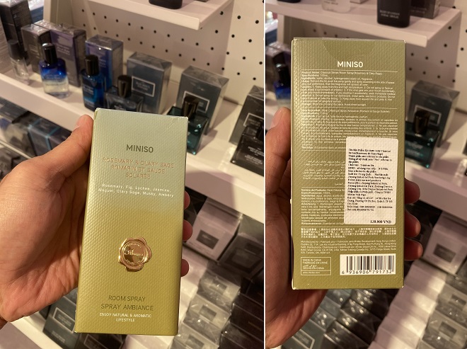 Cụ thể, ghi nhận tại Miniso Huỳnh Thúc Kháng, nhiều sản phẩm nước hoa, mỹ phẩm được bày bán tại đây, trong đó có sản phẩm Xịt thơm Body Classical Series (Rosemary & Clary Sage) một sản phẩm đến từ Trung Quốc, được nhập khẩu và phân phối bởi Công ty TNHH Miniso Việt Nam. Trên bao bì của sản phẩm có dán tem nhãn phụ tiếng Việt ghi đầy đủ thông tin về sản phẩm, ngoại trừ số đăng ký và những thông tin về thời hạn sử dụng sản phẩm như: hạn sử dụng hoặc ngày sản xuất, thông tin cảnh báo về thời gian sử dụng sản phẩm PAO,… Tra cứu trên hệ thống cấp phiếu tiếp nhận số công bố sản phẩm đối với Công ty TNHH Miniso Việt Nam, trong 575 số phiếu đăng ký công bố sản phẩm, không thấy bất kỳ thông tin nào liên quan đến sản phẩm Xịt thơm Body Classical Series (Rosemary & Clary Sage).